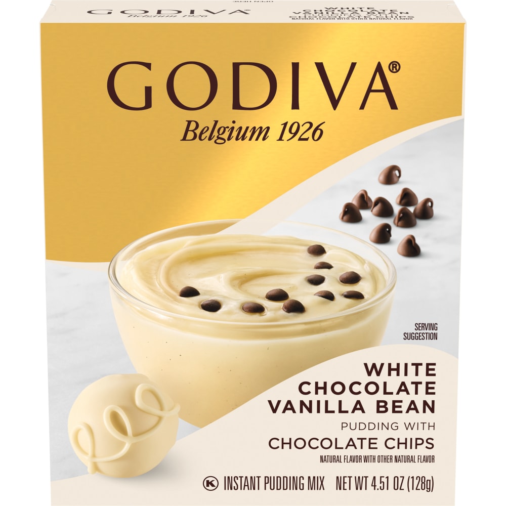 Godiva White Chocolate Vanilla Bean With Chocolate Chips Instant Pudding Mix offers the ultimate chocolate indulgence by bringing the rich, Godiva flavors you know and love. Perfect for everyday indulgences or as a dessert for special occasions, this instant pudding mix features rich white chocolate and vanilla bean flavors accented by chocolate chips creating a classic taste. The powdered mix is sealed in a 4.51 ounce pouch. Whip up the instant white chocolate pudding mix to eat on its own, or add whipped cream topping for extra indulgence, or get creative by using this pudding in dessert cups or as crepe filling. Simply whisk with cold milk and the pudding will soft-set in 5 minutes, meaning you don't have to wait long for the indulgent Godiva flavor. Store leftover pudding in the refrigerator. One 4.51 oz. box of Godiva White Chocolate Vanilla Bean With Chocolate Chips Instant Pudding MixGodiva Instant Pudding Mix offers the chocolate indulgence of Godiva in a quick dessertThis instant white chocolate pudding mix is sealed inside a boxReady in just five minutes for a sweet treat without the waitMakes about five servings per box for sharingIdeal for making a white chocolate pudding pie or other dessertsRefrigerate leftover pudding.
