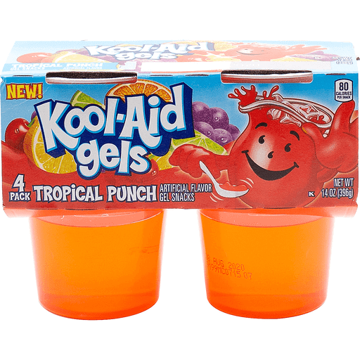 Four cups of Jell-o Kool-Aid Gels Tropical Punch. The cool and refreshing Kool-Aid flavor you know and crave, now in fun Jell-o form. Contains no fat or cholesterol. Only 80 calories per snack. A convenient size to pack in a school lunch or enjoy as an on-the-go snack.