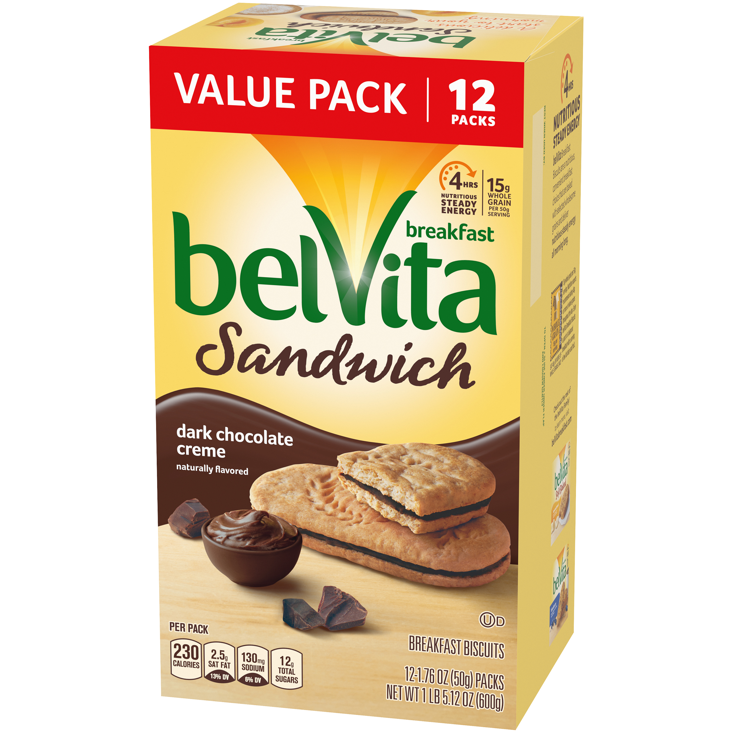 Start your morning off right with delicious belVita Breakfast Sandwich Dark Chocolate Creme Breakfast Biscuits. Featuring luscious dark chocolate flavored creme between two breakfast biscuits, these breakfast biscuits make a delicious instant breakfast food. Specially baked, these BelVita breakfast sandwich cookies contain slow-release carbs that break down gradually in the body to deliver delicious, steady energy all morning long. Each 50 gram serving contains 15 grams of whole grain and 3 grams of fiber for a wholesome and delicious alternative to a traditional chocolate breakfast bar.