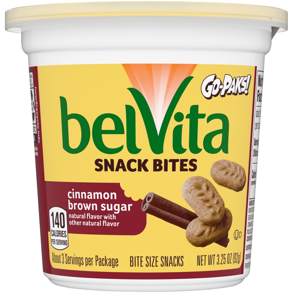 Enjoy a wholesome snack on the go. Bite-sized belVita biscuits are made with real ingredients, like whole grains! Grab one of these convenient Go-Paks for an instant breakfast or quick snack at school, work, or on the road. This package contains 1 Go-Pak of belVita Cinnamon Brown Sugar Mini Breakfast Biscuit Snack Bites. Made with whole grains, oats, and other real ingredients.No artificial flavors, colors, or sweetenersConvenient Go-Pak cup with resealable lid.