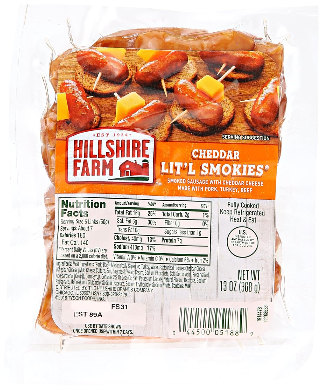 One 13 oz. package of Hillshire Farm® Cheddar Lit’l Smokies® Smoked Sausage. Made with quality cuts of meat and smoked to perfection. Fully cooked and ready in minutes. Perfect for parties and snacking. Fun, crowd-pleasing snack the whole family will enjoy. Simply prepare using stove top, microwave or oven.