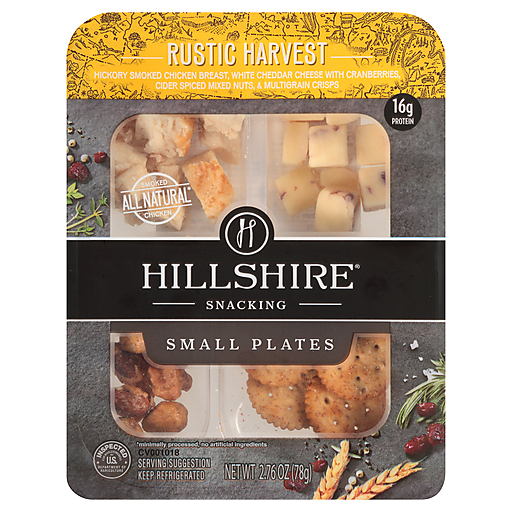Hickory smoked natural chicken breast, white cheddar cheese with cranberries, cider spiced mixed nuts, and multigrain crisps come together in Hillshire Snacking Small Plates for a grown-up twist on snack time. Our Rustic Harvest Small Plate features chef-curated ingredients and flavors such as rich hickory smoke and sweet cider for a truly elevated snacking experience. Try pairing with a Belgian beer to elevate the flavors of this autumn-inspired medley. Perfectly portioned for snacking on-the-go, our Rustic Harvest Small Plate has 16 grams of protein in each ready-to-eat serving. Includes one 2.76 ounce package. We're big believers in a little thing called snack time. To us snacking is not about rushing or mindless eating. It's about turning a few stolen moments into an elevated celebration that deserves to be savored. We're here to turn snacking into an occasion, and you're invited. Minimally processed, no artificial ingredients.