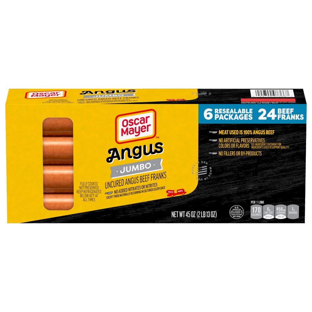 Grill up a winner with Oscar Mayer Jumbo Angus Uncured Beef Franks Hot Dogs. Our jumbo hot dogs are made with no added nitrates or nitrites except those naturally occurring in cultured celery juice, no artificial preservatives, and no by-products, so you can enjoy the great taste and quality you expect. Meat used is 100% Angus beef creating a thick, juicy, jumbo hot dog. Grill our jumbo-sized hot dogs for a family BBQ, roast over a campfire or simply cook in the kitchen for a quick and easy meal. Top your hot dog with ketchup and mustard, or try regional favorites like chili or sauerkraut. Each 24-count, 45-ounce box of hot dogs comes with 6 resealable packages to keep them fresh in the refrigerator.