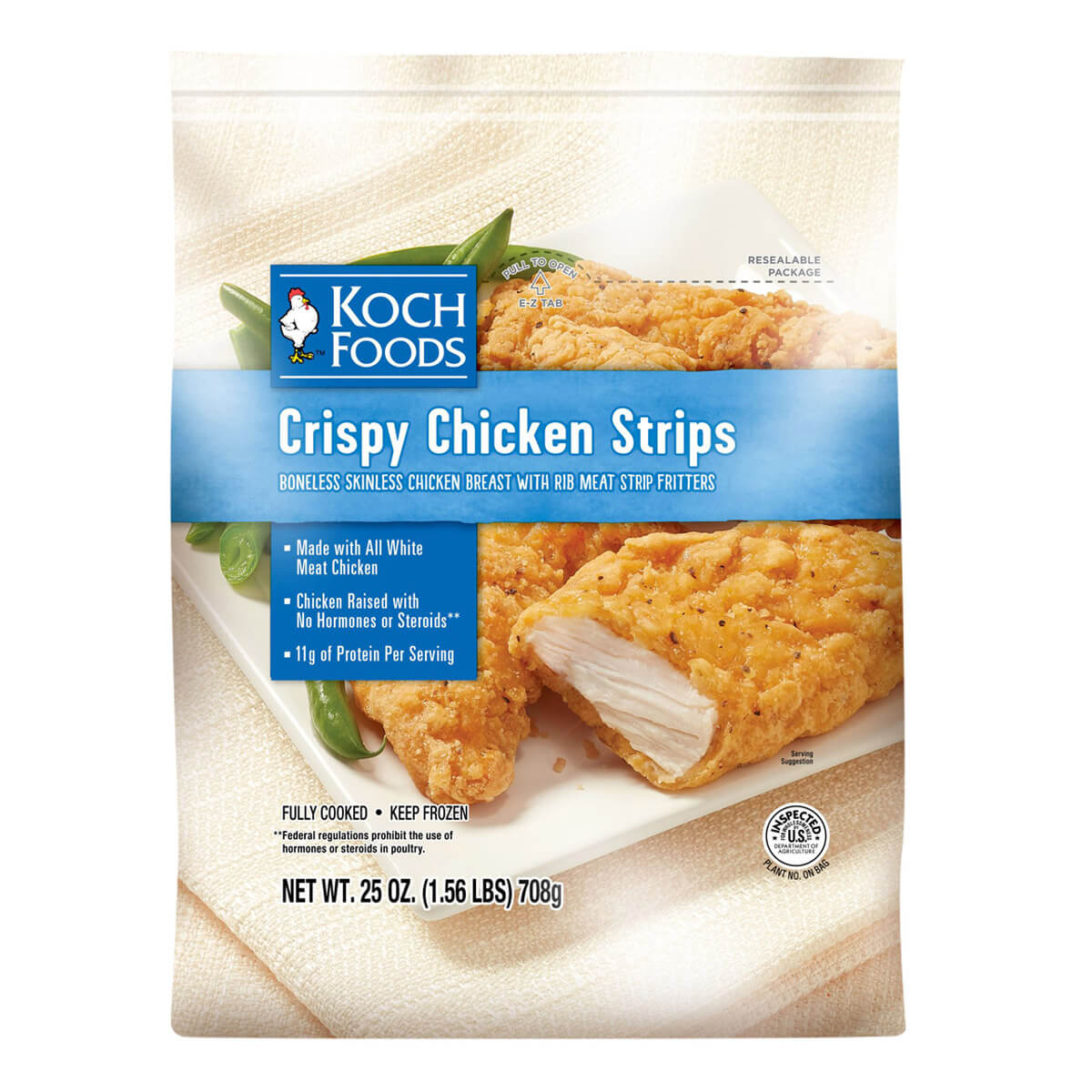 - The manufacturer of Crispy Chicken Strips is Koch Foods.