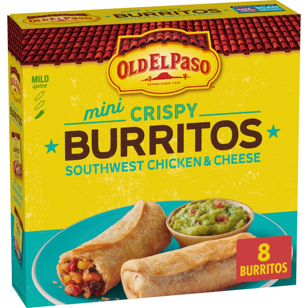 Crunch into mini burritos that bring big zesty taste, big smiles! Old El Paso Southwest Chicken & Cheese Mini Crispy Burritos have a crispy tortilla outside and bold blend of chicken meat, pasteurized process Monterey Jack cheese, corn, peppers and black beans inside. The mild spice heat level is perfect for adults and kids alike. These mini burritos make a tasty and easy addition to any meal or snack. Simply grab a box of Mini Crispy Burritos from the freezer. Then bake in the oven up to 21 minutes, and let stand 2 minutes to complete cooking (filling will be hot, wait until cool enough to eat). Or, pop them in the air fryer basket or microwave following package directions to enjoy crispy mini burritos in minutes. With 8 Southwest Chicken & Cheese Mini Crispy Burritos in every box (4 servings per box), add them to family dinner or an appetizers table. Make a couple boxes of these mini burritos for a party snacks platter or Cinco de Mayo spread. Enjoy as is or pair with guacamole, salsa, sour cream and other favorites. Also try Old El Paso Taco Bites or Stuffed Nachos.
