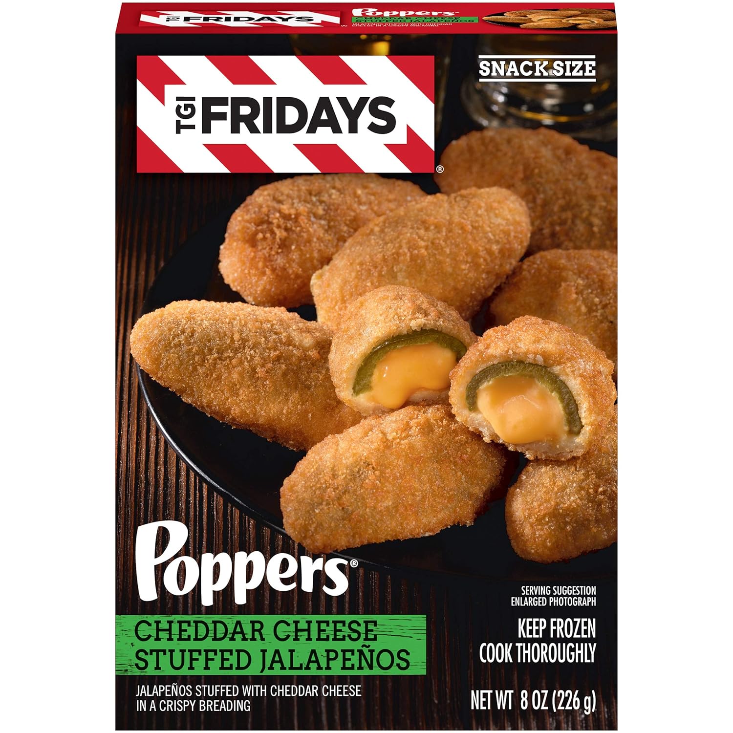 Jalapenos stuffed with cheddar cheese in a crispy breading. Questions or comments? Call 1-800-457-9810, Monday-Friday. Please have packaging available when calling. To learn more about TGI Fridays frozen snacks, visit www.fridaysinyourfreezer.com.