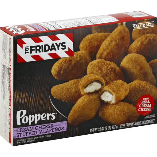 Enjoy your TGI Fridays menu favorites at home with our easy restaurant style appetizers. Ready to heat, TGI Fridays Cream Cheese Stuffed Jalapeno Poppers are a quick and delicious appetizer or party food. Our TGIF crispy breaded jalapeno poppers are stuffed with real cream cheese. Packaged in a box for convenient storage, you can heat our jalapeno poppers in a conventional oven or deep fryer. Store our 32-ounce box of cream cheese stuffed jalapeno poppers in the freezer until ready to prepare. Whether you’re craving jalapeno poppers, potato skins, spinach artichoke dip, chicken bites and wings, mozzarella sticks or sliders, TGI Fridays has frozen appetizers the whole family will enjoy.