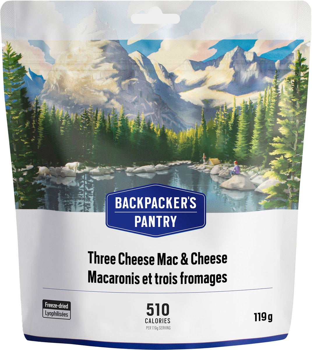 After a day of outdoor fun, there’s nothing like a warm bowl of cheesy goodness to knock out those hunger pains. This camp-friendly spin on a traditional comfort food is full of flavor! The mac and cheese is a rich, creamy blend of Parmesan, Romano, and Cheddar cheeses that can be prepared in a snap. Just add boiling water, stir it up, and then kick back and relax while the freeze-dried dinner prepares itself. 10 year shelf life. 24 g protein. 510 cals per serving. 1 serving.