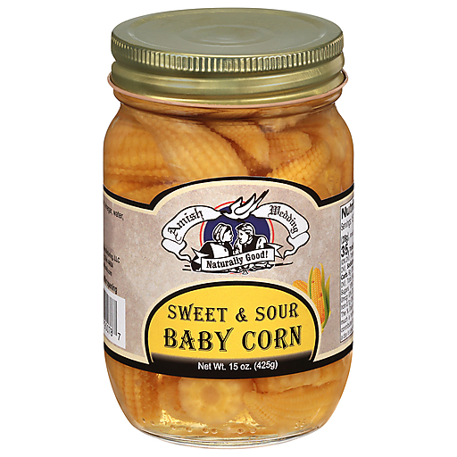- The manufacturer of Sweet & Sour Baby Corn, Sweet & Sour is Amish Wedding.