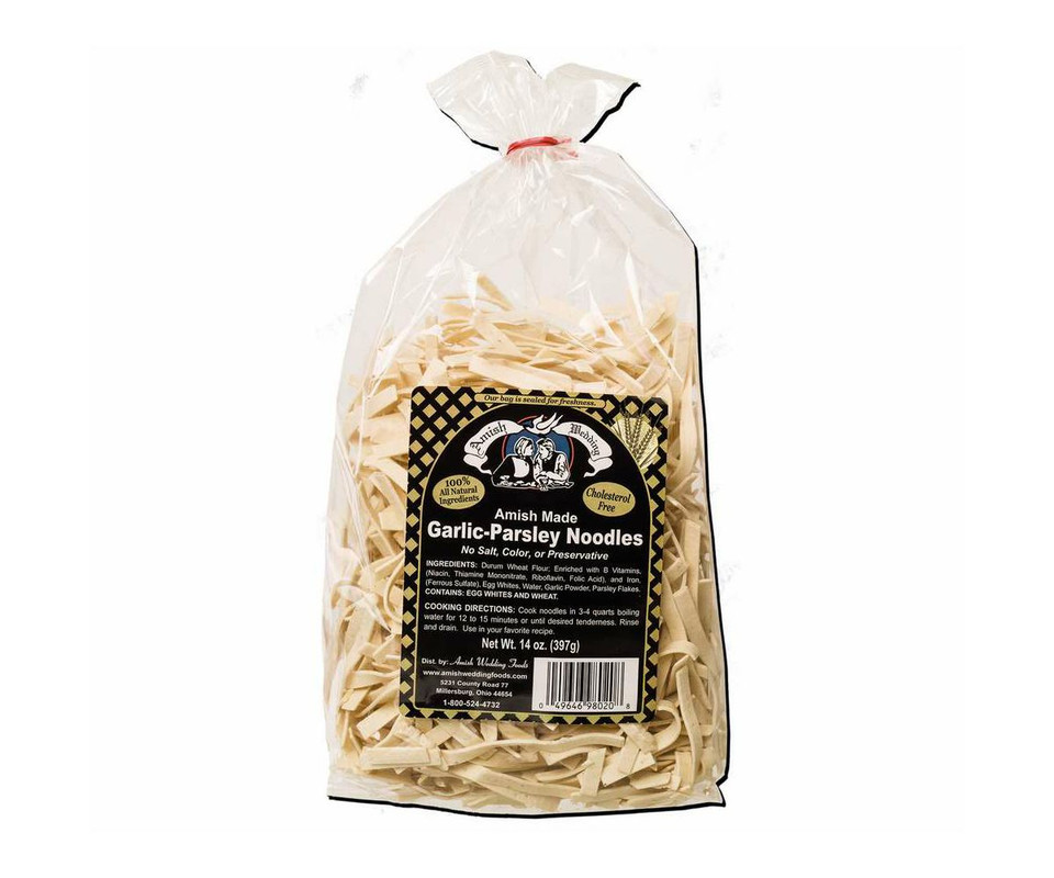 - The manufacturer of Garlic Parsley Noodles is Amish Wedding.