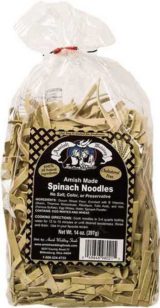 - The manufacturer of Spinach Noodles is Amish Wedding.