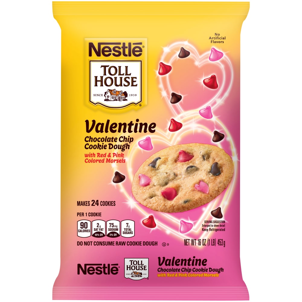 Nestle® Toll House® Chocolate Chip Cookie Dough Valentine. No artificial flavors. Since 1939. With red & pink colored morsels. Makes 24 cookies. Per 1 cookie: 90 Calories. 2g Sat.fat, 10% DV. 75mg Sodium, 3% DV. 6g Sugars. Net Wt 16 oz (1 lb) 453 g.