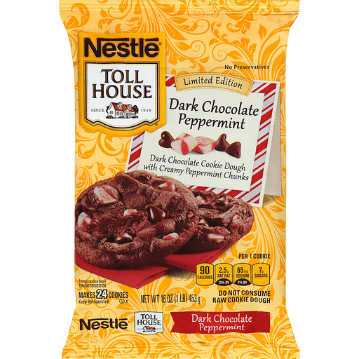 Nestle® Toll House® Limited Edition Dark Chocolate Peppermint Cookie Dough. Since 1939. No preservatives. Dark chocolate cookie dough with creamy peppermint chunks. Makes 24 cookies. Per 1 cookie: 90 calories. 2.5g sat fat, 13% DV. 65mg sodium, 3% DV. 7g sugars. Partially produced with genetic engineering. Open here to make sweet memories. Good Food, Good Life®: Nestle®. Good to know: Nestle® Toll House® cookie dough has 0g trans fat per serving in all varieties. Thoughtful Portion™: 1 portion = 1 cookie. Enjoy a Nestle® Toll House® cookie with a cup of nonfat milk for a delicious snack. Connect with us: For delicious recipes and baking inspiration, visit us at verybestbaking.com. Text or call us 1-800-289-7314. Nutritional Compass®. All trademarks are owned by Societe Des Produits Nestle S.A., Vevey, Switzerland.
