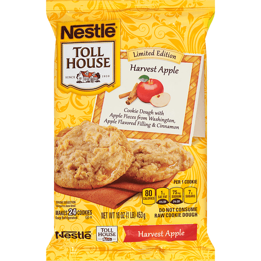 Nestle® Toll House Limited Edition Harvest Apple Cookie Dough. Since 1939. With apple pieces from Washington, apple flavored, filling & cinnamon. Makes 24 cookies. Per 1 cookie. 80 calories. 1g sat fat, 5% DV. 75mg sodium, 3% DV. 7g sugars. Harvest apple. Partially produced with genetic engineering. Use safe food handling procedures. Thoughtful Portion™. Portion = 1 cookies. Enjoy a Nestle® toll House® cookies with a cup of nonfat milk for a delicious snack. Good Food, Good Life®. Nutritional Compass®. Connect with us for delicious recipes and baking inspiration, visit us at verybestbaking.com text or call us 1-800-289-7314. All trademarks are owned by Societe de Produits Nestle S.A., Vevey, Switzerland.