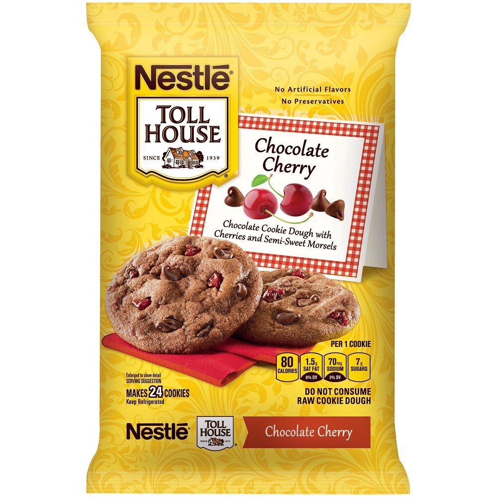 Nestle® Toll House® Chocolate Cherry Cookie Dough. Since 1939. No artificial flavors. No preservatives. Chocolate cookie dough with cherries and semi-sweet morsels. Per 1 Cookie:. 80 Calories. 1.5g sat fat, 8% DV. 70mg sodium, 3% DV. 7g sugars. Makes 24 Cookies. Good Food, Good Life®. Nestle®. Good to know: Nestle® Toll House® cookie dough has 0g trans fat per serving in all varieties. Thoughtful Portion™ 1 portion = 1 cookie. Enjoy a Nestle® Toll House® cookie with a cup of nonfat milk for a Delicious snack. Good to connect: verybestbaking.com. 1-800-289-7314. Nutritional Compass®. All trademarks are owned by Societe des Produits Nestle S.A., Vevey, Switzerland.