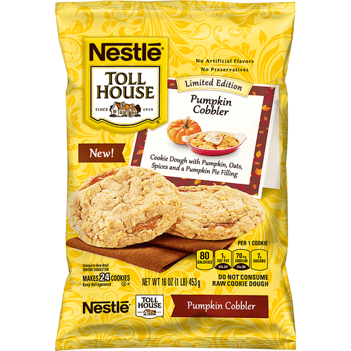 Nestle® Toll House® Cookie Dough Pumpkin Cobbler. Since 1939. No artificial flavors. No preservatives. Limited edition. New! Cookie dough with pumpkin, oats, spices and a pumpkin pie filling. Makes 24 cookies. Per 1 cookie: 80 Calories. 1g Sat fat, 5% DV. 70mg Sodium, 3% DV. 7g Sugars. Net Wt 16 oz (1 lb) 453 g.