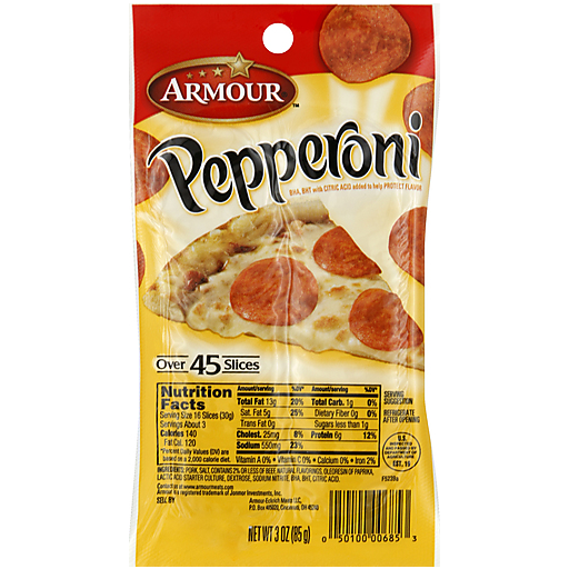 Armour Sliced Pepperoni makes mealtime and snacking easier with flavorful slices that are ready to eat or add to recipes. This gluten free pepperoni fits your family's various dietary needs. Made with a mix of pork and beef, this mild pepperoni adds a rich boost to classic dishes. Each slice is consistently sized, so the Armour pepperoni pieces cook evenly, and then they're ready to add to all your favorite dishes or eat as a quick snack. Create your supreme pizza by topping your favorite dough with ready to eat pepperoni slices plus sausage and veggies, or make a pepperoni and cheese calzone.
