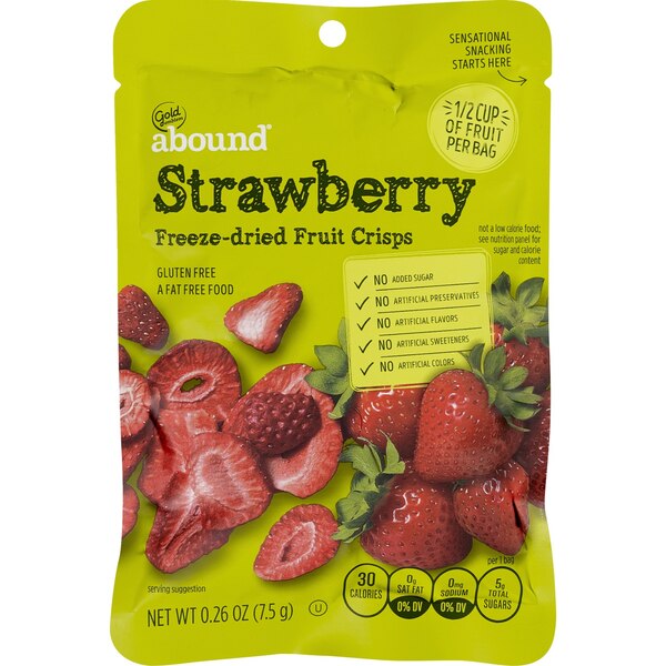We love the sweet simplicity of fruit. One might say we're a bit obsessed with nature's candy โ which is why we packed cup of fruit into every bag. To achieve our perfectly light and airy Strawberry Freeze-dried Fruit Crisps, we picked premium strawberries at their peak ripeness, sliced 'em up, then freeze-dried them into light, flavorful crisps. They're delicious and naturally sweet. At Gold Emblem Abound, we believe a healthy life should be a tasty life. That's why we carefully source nutritious ingredients that satisfy your cravings, but never give up great taste. We make choosing nourishing snacks simple. Because with us, wholesome choices abound.
