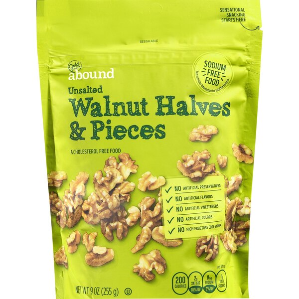 Full of rich flavor, our Unsalted Walnut Halves & Pieces are great for snacking โ and balancing out sweet dishes, like the American classic Waldorf Salad. So dress them up for a date at the Waldorf Astoria, where walnuts have played a starring role for more than a century. These wonderful nuts are definitely a treat worth sharing. At Gold Emblem Abound, we believe a healthy life should be a tasty life. That's why we carefully source nutritious ingredients that satisfy your cravings, but never give up great taste. We make choosing nourishing snacks simple. Because with us, wholesome choices abound.