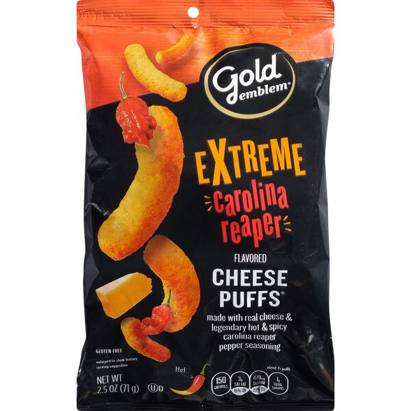 - The manufacturer of Extreme Carolina Reaper Flavored Cheese Puffs, Extreme Carolina Reaper is Gold Emblem.