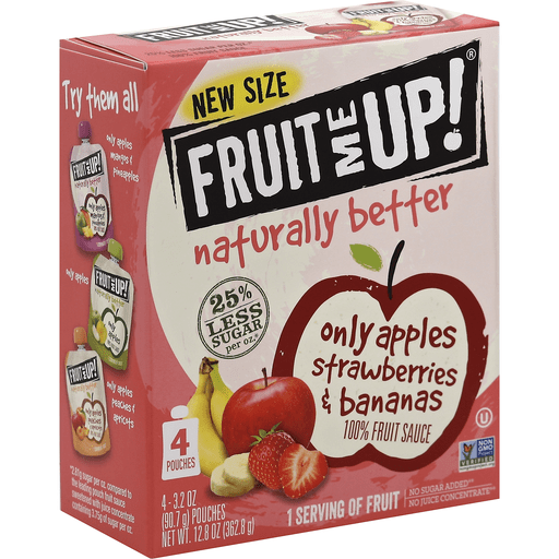 1 serving of fruit. New size. Naturally better. 25% less sugar per oz (Not a low calorie food. See nutritional panel for more information on sugar and calorie content). Non GMO Project verified. nongmoproject.org. No sugar added (2.81 g sugar per oz compared to the leading pouch fruit sauce sweetened with juice concentrate containing 3.75 g of sugar per oz). No juice concentrate (Not a low calorie food. See nutritional panel for more information on sugar and calorie content). The convenient way for kids to enjoy naturally better snacking, anywhere, anytime with no-mess. 1 serving of fruit per pouch. Every pouch is made with fresh apples! Certified gluten-free. www.FruitMeUp.com. Please recycle. Made in the USA.