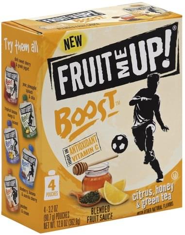With other natural flavors. New. High in antioxidant vitamin C. Fruit pouches with added nutrients for a naturally better snack. Kids, teens and families will enjoy a great tasting fruit Boost snack anywhere, any time. Helps to maintain your immune system. All natural ingredients. Boost of nutrition. Made with fresh apples. Made with no genetically or engineered ingredients. Certified gluten-free. www.FruitMeUp.com. Please recycle. Made in the USA.