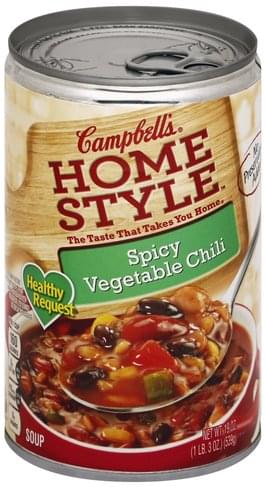 Campbell's® Homestyle Healthy Request® Spicy Vegetable Chili is hearty, packed with veggies and seasoned with spices that give it a real kick. It's low in fat and cholesterol and with no added MSG*, so go ahead, dig in and discover how eating healthy never tasted so good. *Small amount of glutamate occurs naturally in yeast extract. The Taste That Takes You Home® 0 Grams Trans Fat Per Serving No MSG Added* *Small amount of glutamate occurs naturally in yeast extract.