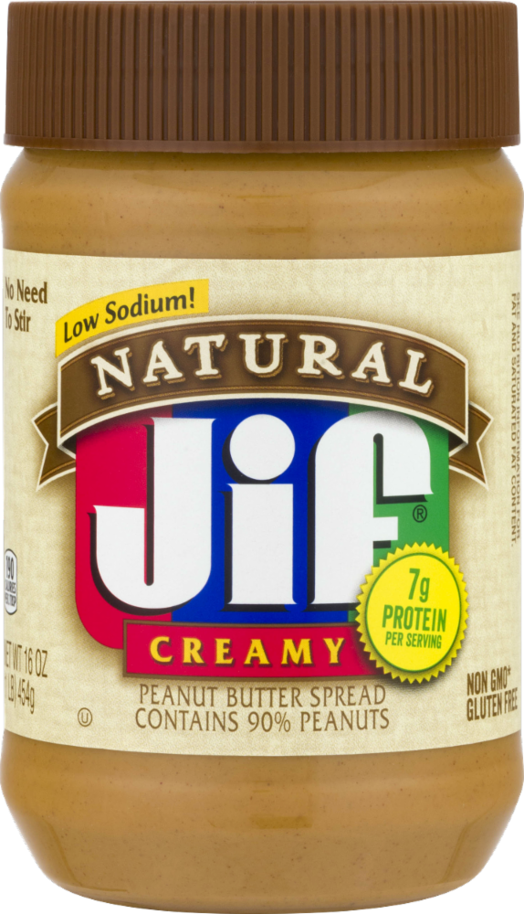 Contains 90% peanuts. Low sodium! Fresh roasted peanut taste. 190 calories per 2 tbsp. Natural ingredients, minimal oil separation is natural. Look for the flavor seal. Contains no preservatives. Visit us at www.jif.com. This package is recyclable. However, recycling programs for this package may not exist in your area.