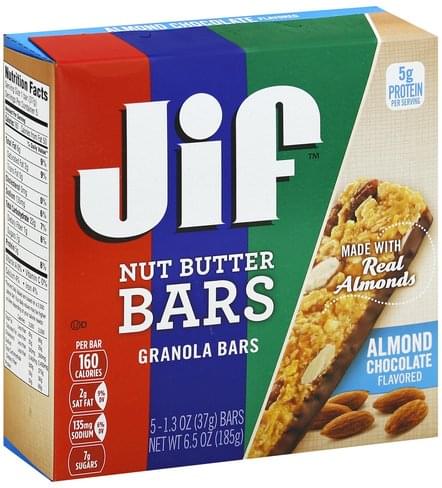 - The product category for Jif, Nut Butter Bars, Almond Chocolate, Almond Chocolate is Cereal & Granola Bars.