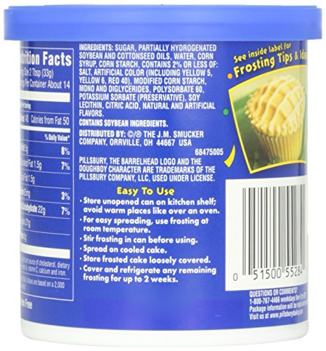 Pillsbury Creamy Supreme® Butter-Cream Frosting. Naturally and artificially flavored. Per 2 tbsp: 140 calories. 2.5g sat fat, 13% DV. 65mg sodium, 3% DV. 20g sugars. Produced with genetic engineering. Gluten free. Questions or comments 1-800-767-4466. Package information will be helpful when contacting us. More tips & tricks at pillsburybaking.com. ©/® The J.M. Smucker Company. Pillsbury, The Barrelhead logo and The Doughboy Character are trademarks of The Pillsbury Company, LLC, used under license.