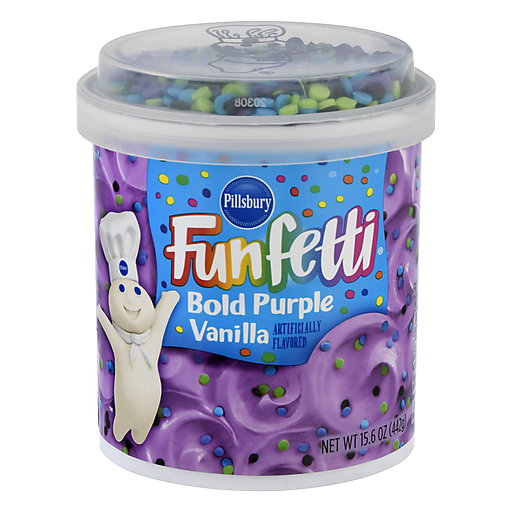 Frosting, Bold Purple Vanilla. Artificially flavored. Questions or comments? 1-800-767-4466. Package information will be helpful when contacting us. Visit us at Pillsburybaking.com.