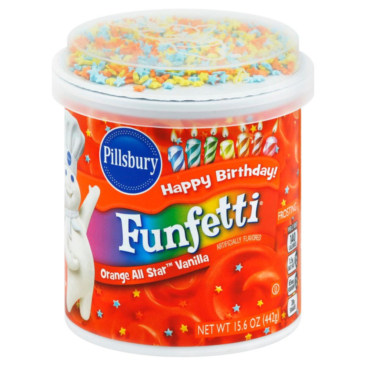 Pillsbury Funfetti® Orange All Star Vanilla Frosting. Happy Birthday. Artificial flavor. Per 2 Tbsp. 140 calories. 1.5g sat fat; 8% DV. 65mg sodium 3% DV. 20g sugars.