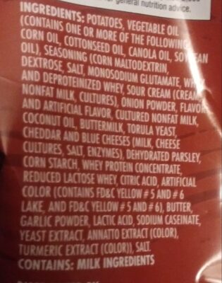 Potatoes, Vegetable Oil (Contains One or More of the Following: Corn Oil, Cottonseed Oil, Canola Oil, Soybean Oil), Seasoning (Corn Maltodextrin, Dextrose, Salt, Monosodium Glutamate, Whey and Deproteinized Whey, Sour Cream (Cream Nonfat Milk, Cultures). Onion Powder, Flavor and Artificial Flavor, Cultured Nonfat Milk, Coconut Oil, Buttermilk, Torula Yeast, Cheddar Anbarlue Cheeses (Milk, Cheese Cultures, Salt, Enzymes), Dehydrated Parsley, Corn Starch, Whey Protein Concentrate, Reduced Lactose Whey, Citric Acid, Artificial Color (Contains FD&C Yellow # 5 and #6 Lake, and FD&C Yellow # 5 and # B), Butter Garlic Powder, Lactic Acid, Sodium Caseinate, Yeast Extract, Annatto Extract (Color), Turmeric Extract (Color)), Salt.