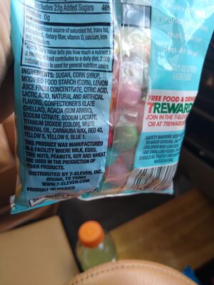 Ingredients: Sugar, Corn Syrup, Modified Food Starch (Corn), Lemon Juice from Concentrate, Citric Acid, Lactic Acid, Natural and Artificial Flavors, Confectioner'S Glaze (Shellac), Acacia (Gum Arabic), Sodium Citrate, Sodium Lactate, Titanium Dioxide [Color], White Mineral Oil, Carnauba Wax, Red 40, Yellow 5, Yellow 6, Blue 1.