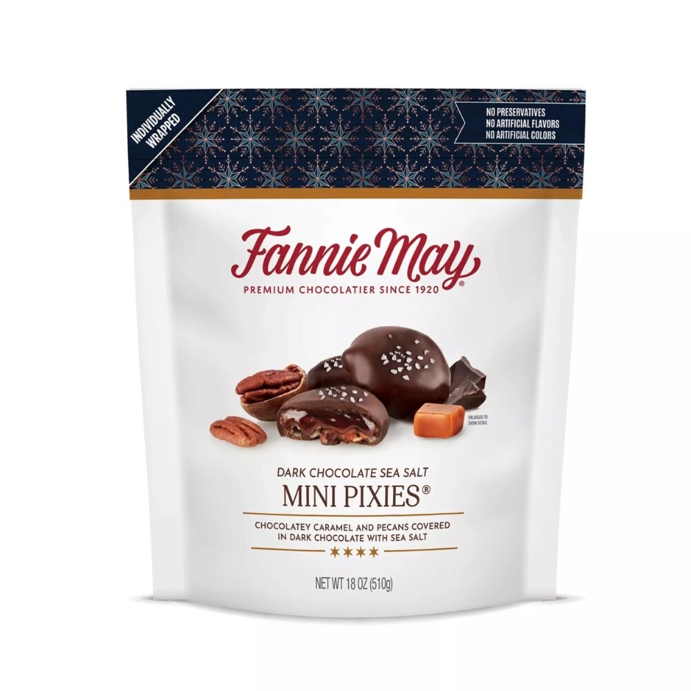 - The manufacturer of Chocolatey Caramel and Pecans Covered in Dark Chocolate with Sea Salt Mini Pixies is Fannie May.