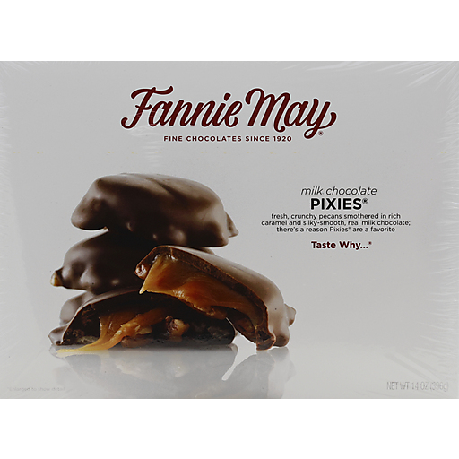 Fresh, crunchy pecans smothered in rich caramel and silky-smooth, real milk chocolate; there's a reason Pixies are a favorite. Taste why. Fine chocolates since 1920. Fannie May Confections has long been committed to making only the finest chocolates, candies and desserts. Since our doors opened in 1920, we've used only the freshest ingredients and strict oversight in maintaining the integrity of our products and recipes. We understand our quality and consistency is what keeps our customers coming back for more. Enjoy! www.fanniemaybrands.com. Questions? 1-800-333-3629.