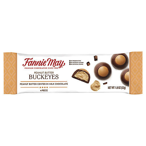 Peanut butter center in milk chocolate. No artificial flavors. Premium chocolates since 1920. No preservatives. No artificial colors. www.fanniemay.com. Questions? 1-800-333-3629; www.fanniemay.com.