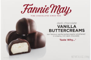 Fannie May® Dark Chocolate Vanilla Buttercreams. Fine chocolates since 1920. Our famous vanilla buttercreams smothered in creamy, rich dark chocolate. Taste Why®.. Net wt 6.5 oz (184g). Fannie May® confections has long been committed to making only the finest chocolates, candies, and desserts. Since our doors opened in 1920, we've used only the freshest ingredients and strict oversight in maintaining the integrity of our products and recipes. We understand our quality and consistency is what keeps our customers coming back for more. Enjoy! www.fanniemay.com.