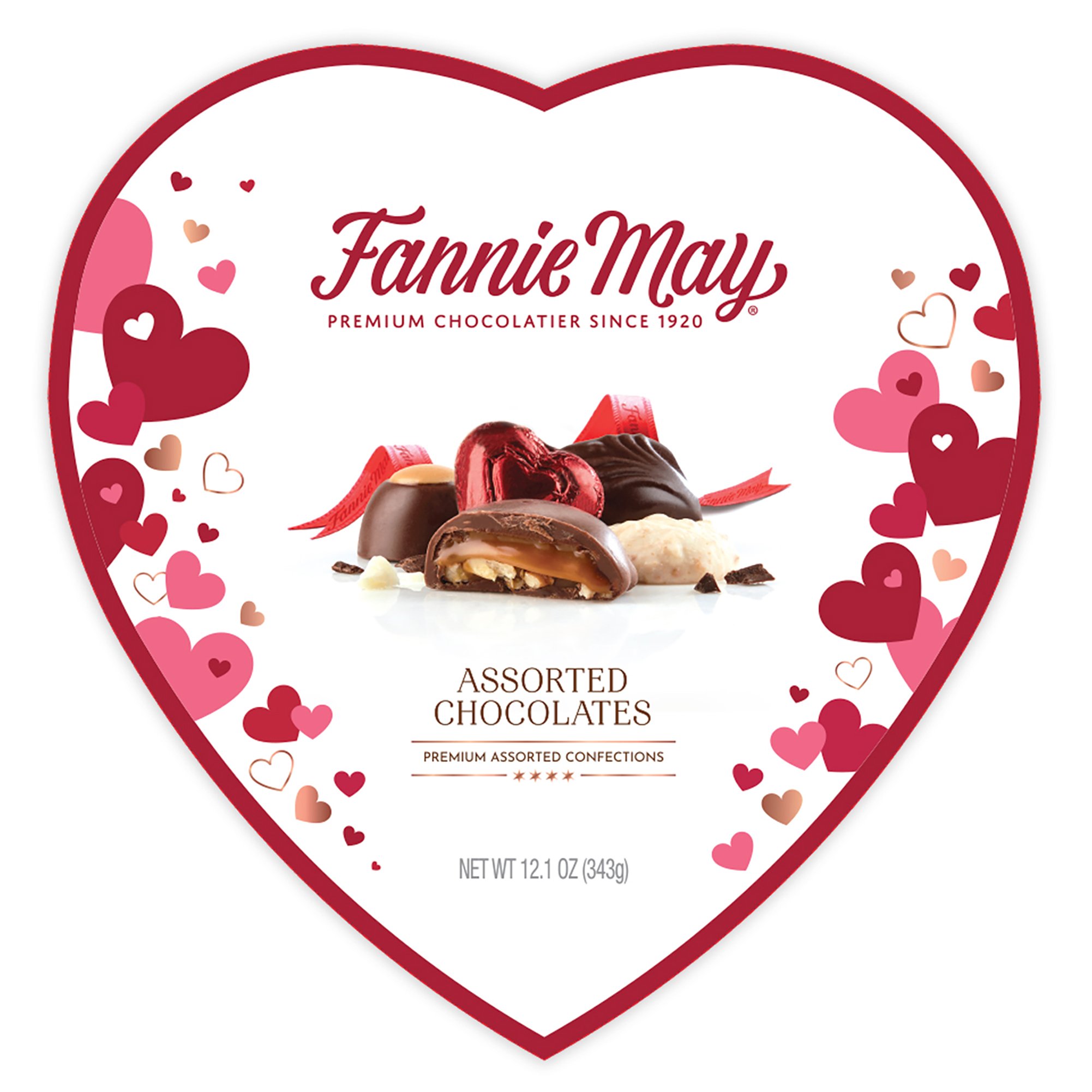 Assortment Boxes. Chocolate Candy. Grocery & Gourmet Food. Snacks & Sweets. Opened in Chicago in 1920, Fannie May began with only a handful of recipes and an unwavering commitment to quality. Today, it makes over 100 different American confections—like the pieces in our Assorted Chocolates. The iconic tastes in this assortment come from combining our most decadent recipes: Milk Chocolate Pixies, Peanut Butter Buckeyes, Solid Milk Chocolate Hearts, White Confection Pretzel Clusters, Dark Chocolate Brownie Batter Truffles and more. Now marry that with a sweet legacy of crafting delicious chocolate recipes and the very best ingredients, and you have an assorted candy variety pack that has found its way into the hearts and homes of confection lovers. Lovingly wrapped in an elegantly designed heart-shaped box, this romantic treat is ready to gift your Valentine. An American chocolatier, Fannie May is proud to continue developing new and innovative confections families are sure to love and share together for years to come.
