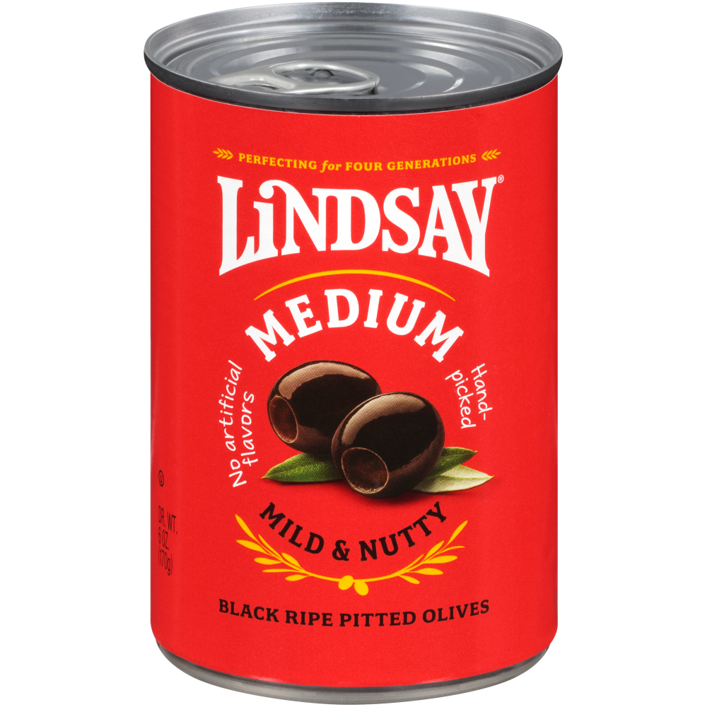 Lindsay Medium Pitted Ripe Black Olives 6 oz - mild, balanced, and made with love. Middle olive syndrome! Not the biggest or the smallest. These mid-sized black ripe olives are attention grabbers. Lunch is a lot more interesting when theyâre around. Enjoy them on their own, or as an addition to sandwiches and salads. Nothing average about these ripe olives. Gluten free. Cholesterol free. Non-GMO. Perfecting for four generations. Unmatched quality and taste! No major allergens. Olives contain naturally occurring oil which may appear on the fruit or the brine. Only 20 calories per serving!
