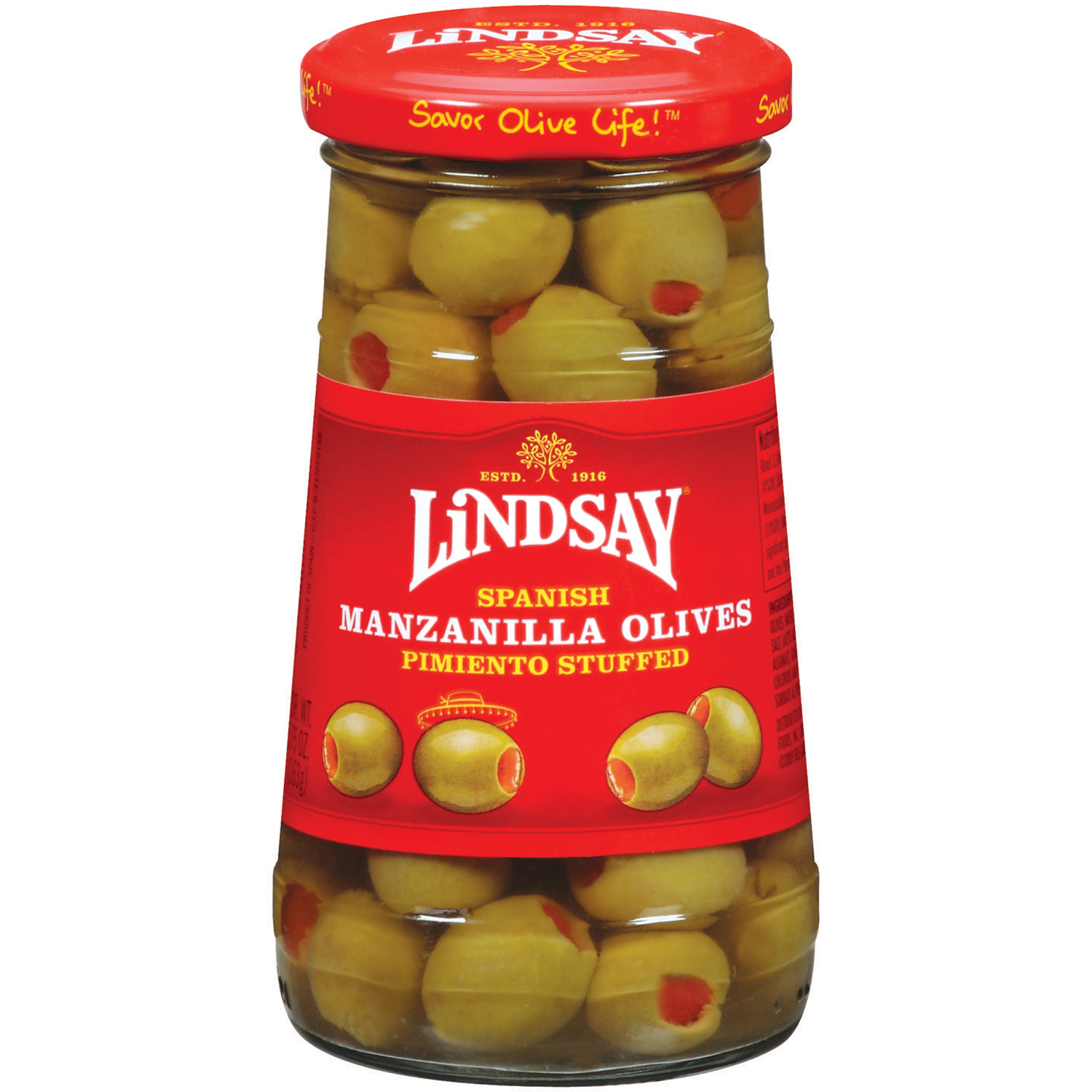 Lindsay Spanish Pimiento Stuffed Manzanilla Olives, 5.75 oz glass. Delicious on a slice of pizza, in potato salad, in any salad, on a cocktail, or our personal favorite, straight out of the jar! Stuffed with pimiento giving off a tart and zesty flavor. These olives make for a wonderful snack and can be enjoyed on the go. These olives are also gluten free, vegan, and cholesterol free making them suitable for a variety of dietary concerns. Non-GMO. Perfecting for four generations. Only 25 calories per serving!