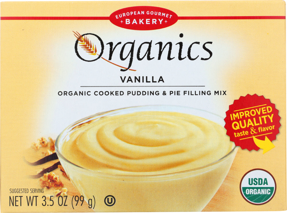 - The product category for European Gourmet Bakery, Organics, Organic Cooked Pudding & Pie Filling Mix, Vanilla is Pudding & Gelatin Snacks.