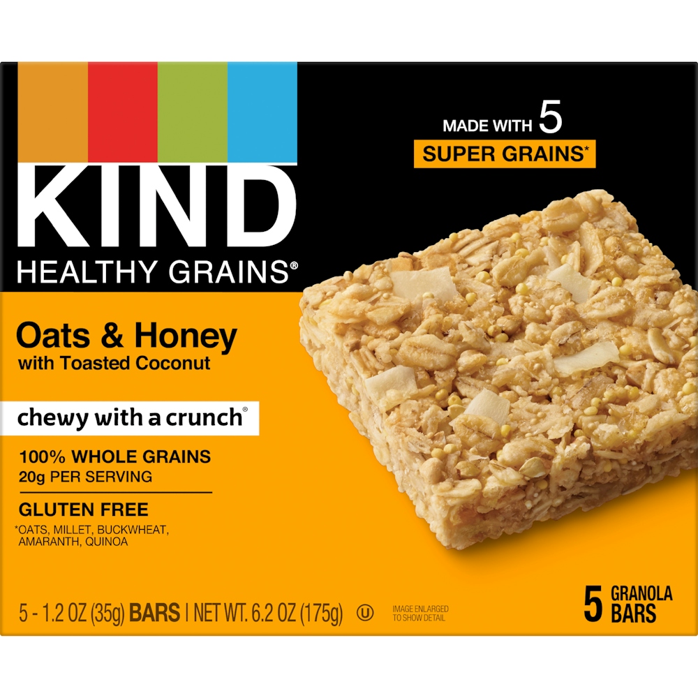 Kind oats & honey granola bars have a unique chewy and crunchy texture. We combine oats, buckwheat, amaranth, millet and quinoa with sweet honey and toasted coconut. Each granola bar provides 22 g. Of whole grains per serving. Our gluten-free granola bars come in one box of five and are non-gmo project verified.