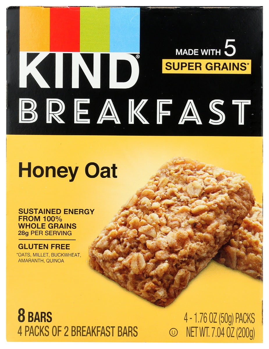 KIND Breakfast Honey Oat bars are a wholesome, healthy snack made with 100% whole grains for sustained energy. KIND Honey Oat breakfast bars are made with five super grains—oats, buckwheat, millet, amaranth and quinoa—and baked with a touch of honey for a chewy, soft baked addition to your breakfast. These KIND bars come in individually wrapped two bar packs that are perfect for convenient, on-the-go gluten free snacks. Each two bar pack has at least one full serving of whole grains. KIND Breakfast bars help provide sustained energy whether you need a nutritious snack for your lunchbox or nutrition bars to grab on your way out the door. Made with quality, wholesome ingredients, these gluten free breakfast bars contain 28 grams of whole grains per serving and 0 grams of trans fat. These healthy snacks are also dairy free and made without genetically engineered ingredients.