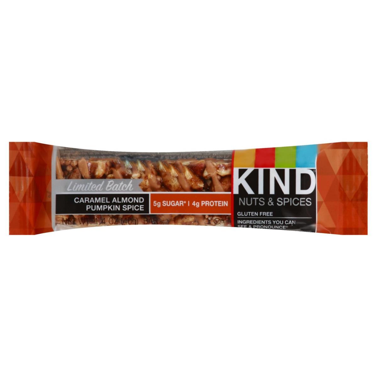 Limited batch. Caramel almond pumpkin spice. 5 g sugar (50% less sugar per bar than the average nutrition bar. This bar has 5 g sugar; the average nutrition bar has 12 g sugar). 4 g protein. Gluten free.