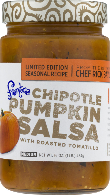 With roasted tomatillo. Limited edition seasonal recipe. 100% natural. hand-crafted with fresh ingredients. All natural. No preservatives. From the kitchen of Chef Rick Bayless. I love salsa in every season. But especially in fall, because that's when we make this unexpectedly delicious combination of velvety pumpkin and tangy roasted tomatillos with the sweet-smoky glow of chipotle chiles. Oh, and there's a little roasted garlic, too, just for good measure. Scoop it up with our artisanal Frontera tortilla chips. Our spoon it on roasted chicken or slow-cooked pork. You'll be happy you did.