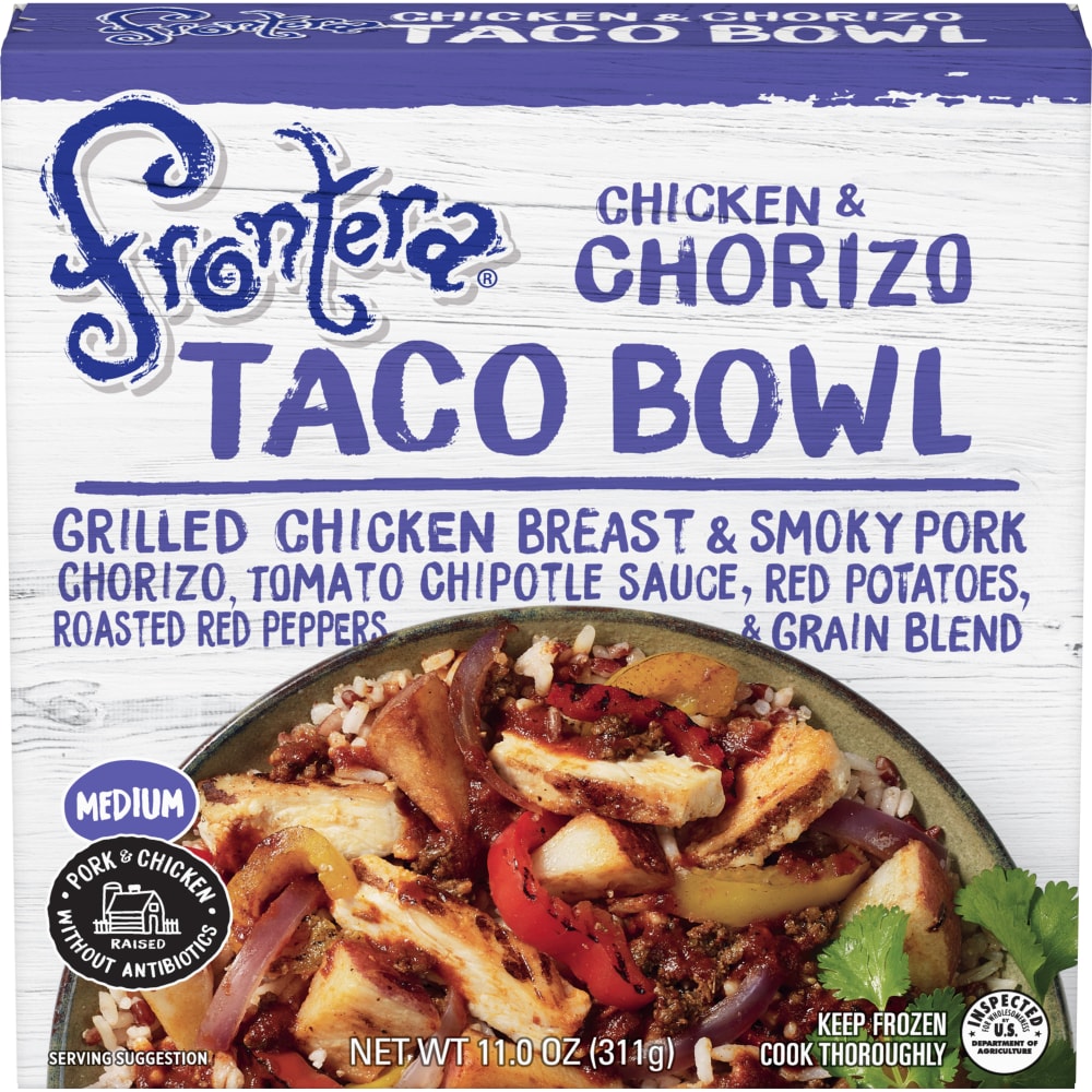- The manufacturer of Medium Grilled Chicken Breast & Smoky Pork Chorizo, Tomato Chipotle Sauce, Red Potatoes, Peppers & Grain Blend Taco Bowl, Chicken & Chorizo is Frontera.