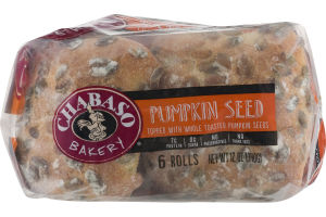 Chabaso Bakery® Pumpkin Seed Rolls. Topped with whole toasted pumpkin seeds. 7g protein. 0g sugar. No preservatives. No trans fats. 6 rolls. 6 pumpkin seed rolls. Artisan breads. Simple ingredients. Our handcrafted breads are hearth-baked in European ovens according to old world traditions. Wholesome ingredients are mixed into doughs using the age-old techniques of artisan bakers. Long fermentation times develop flavors and textures to perfection. Special ovens ensure great, thin crusts, chewy, moist interiors and authentic flavors. Our pumpkin seed rolls are crunchy and nutty in flavor, and are topped with whole toasted pumpkin seeds. Enjoy plain, toasted & buttered, with cream cheese or jam for breakfast and snacks. Also great for delicious sandwiches & appetizers and as a complement to any meal. Your call. Always delicious! Exceptionally crunchy goodness and nutty flavor topped with whole toasted pumpkin seeds. Free bread for the community. Over 800,000 loaves given away since 2007. Family owned since 1981. Visit us at www.chabaso.com.