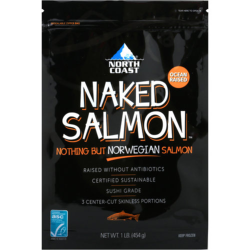 Raised without antibiotics. Certified sustainable. Color added through feed. Nothing but Norwegian salmon. Sushi grade. 3 center-cut skinless portions. Ocean raised. Seafood from Norway. Naked Norwegian Salmon are sustainably raised in the pristine fjords of Norway, which border the Norwegian sea in the arctic circle. Raised under some of the world’s strictest farming standards-free of antibiotics, growth hormones and preservatives-each salmon portion is packed with 1800 mg of heart healthy omega 3's. Professional and home chefs agree. Naked salmon is the prime choice for excellent flavor, texture and extraordinary taste. At sea level oyster bar in historic Newburyport, MA we are known for great tasting seafood. The freshness and quality of Naked Norwegian Salmon guarantees our guests come back for more. That's why we proudly serve naked Norwegian salmon or nothing. www.northcoastseafoods.com.