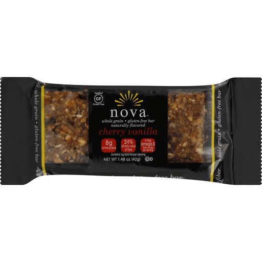 Naturally flavored. Certified gluten-free. Whole grain. Gluten-free bar. 8 g whole grains. 24% of daily value of fiber. 0.48 g omega-3 fatty acids per serving. Contains 3 g total fat per serving. www.novabar.org. 6 g fiber.